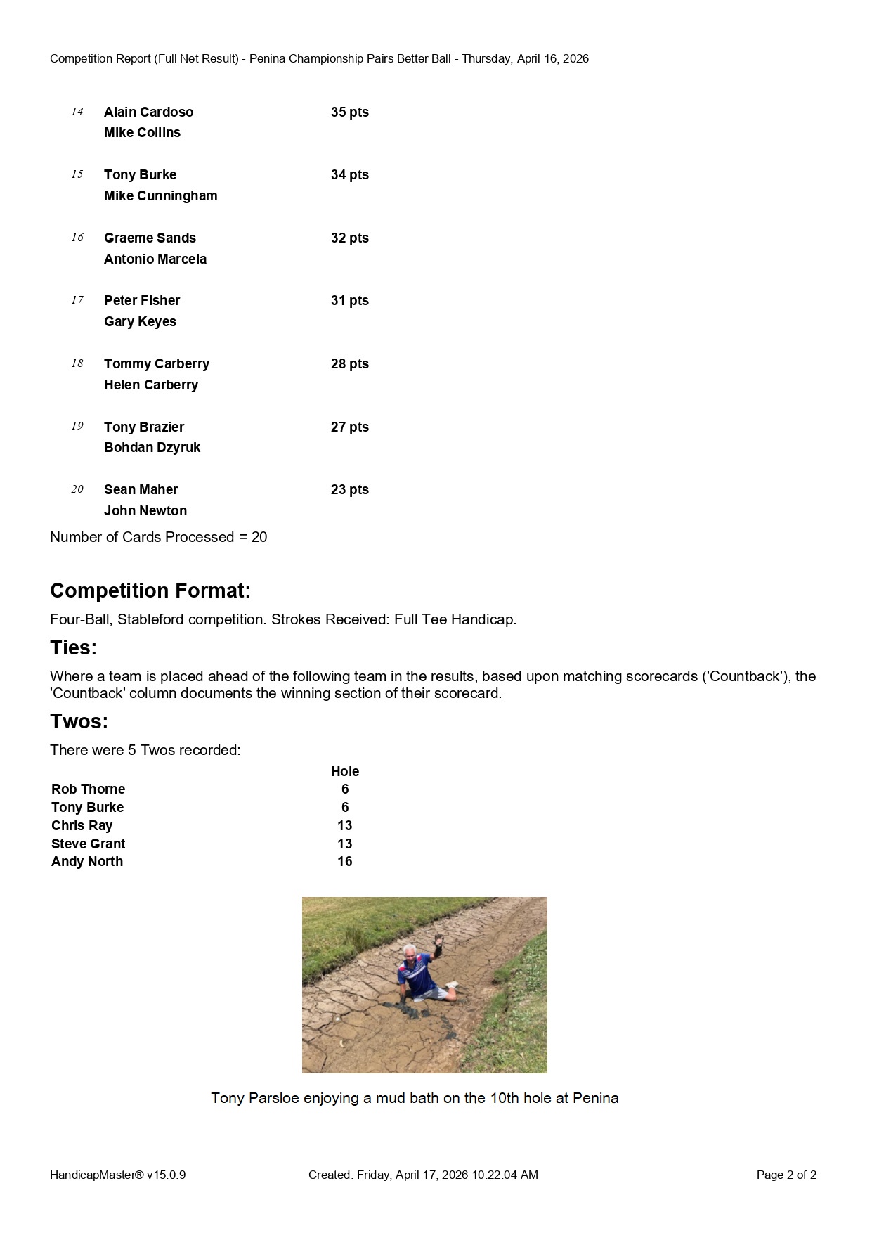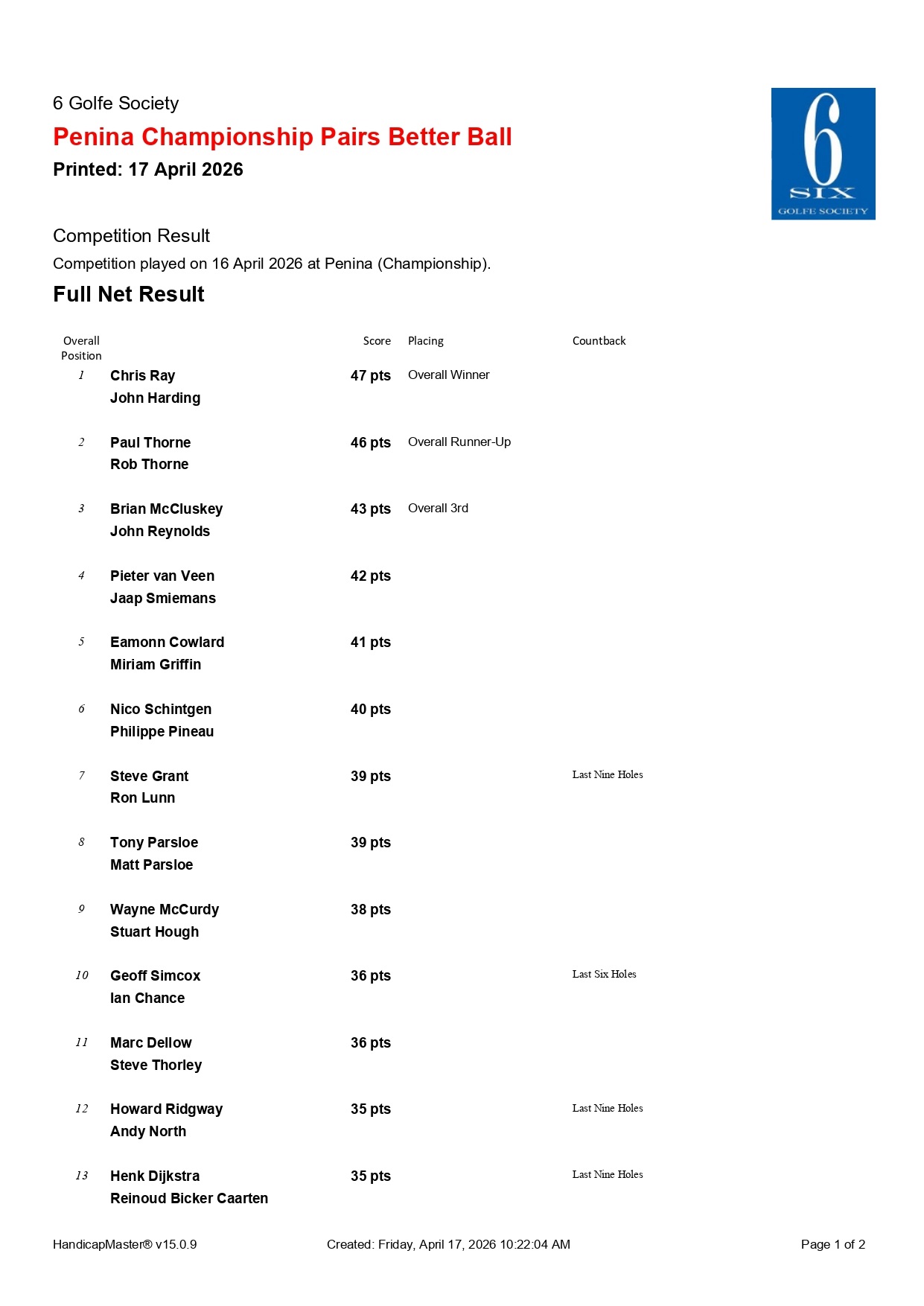 PAIRS BETTER BALL COMPETITION – 16th APRIL 2026 at THE PENINA CHAMPIONSHIP COURSE